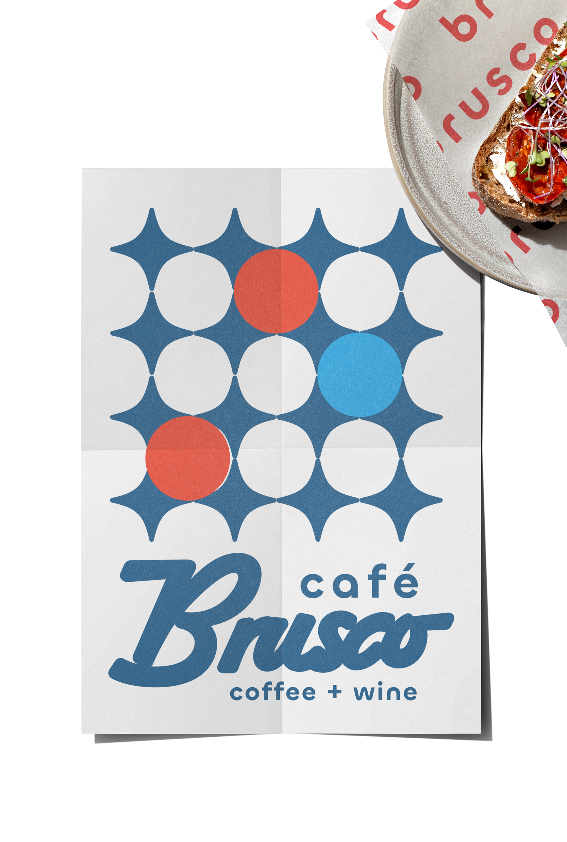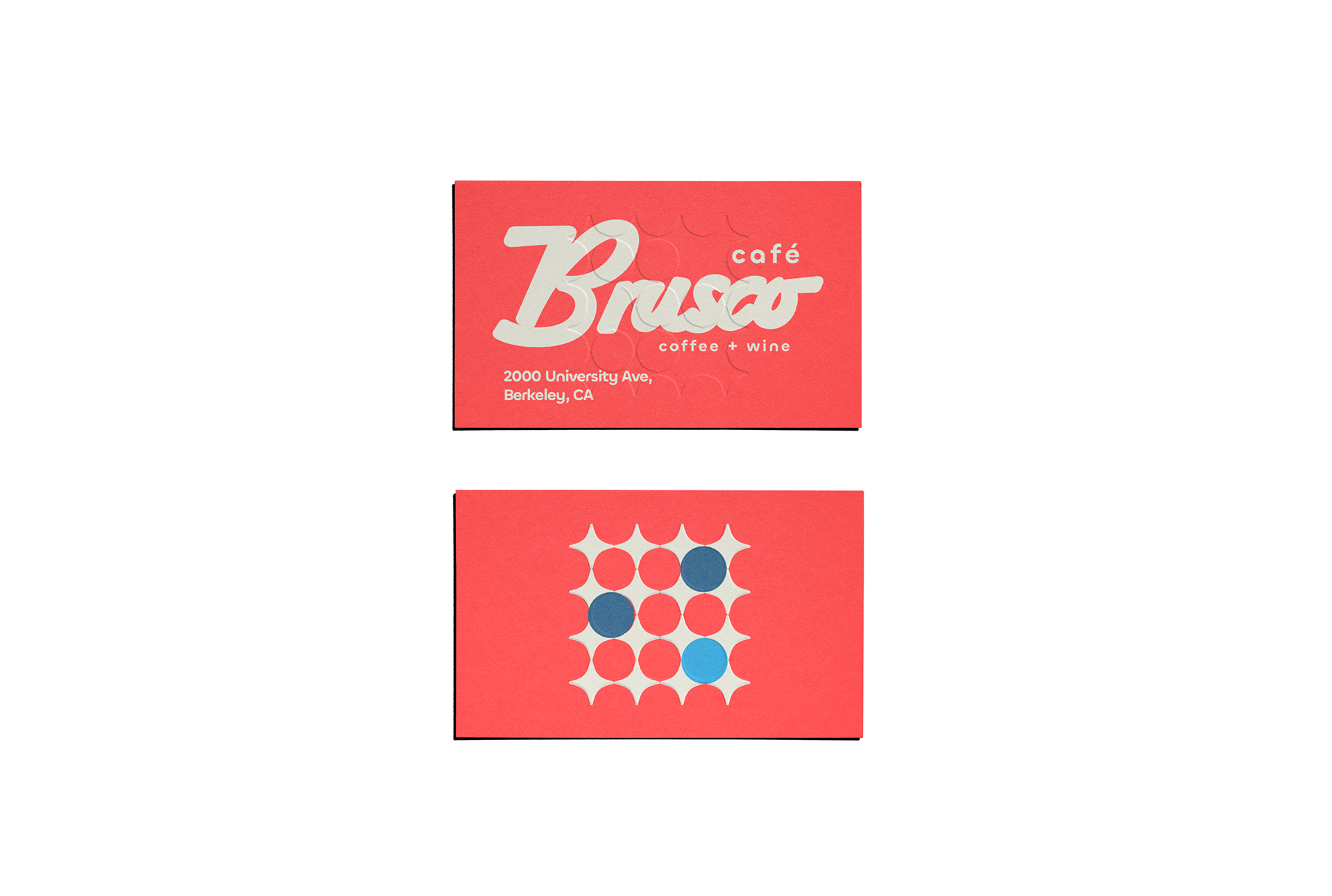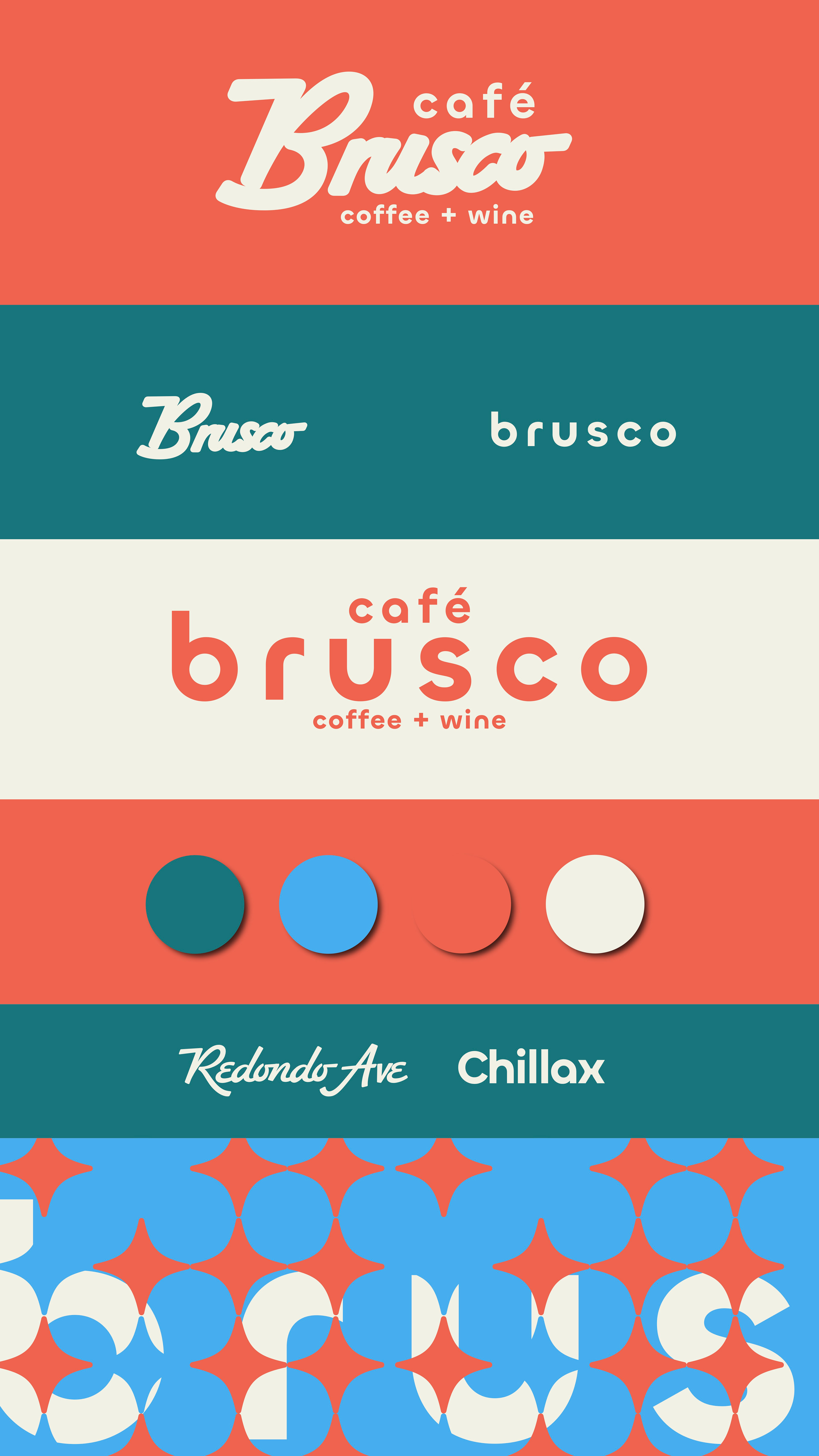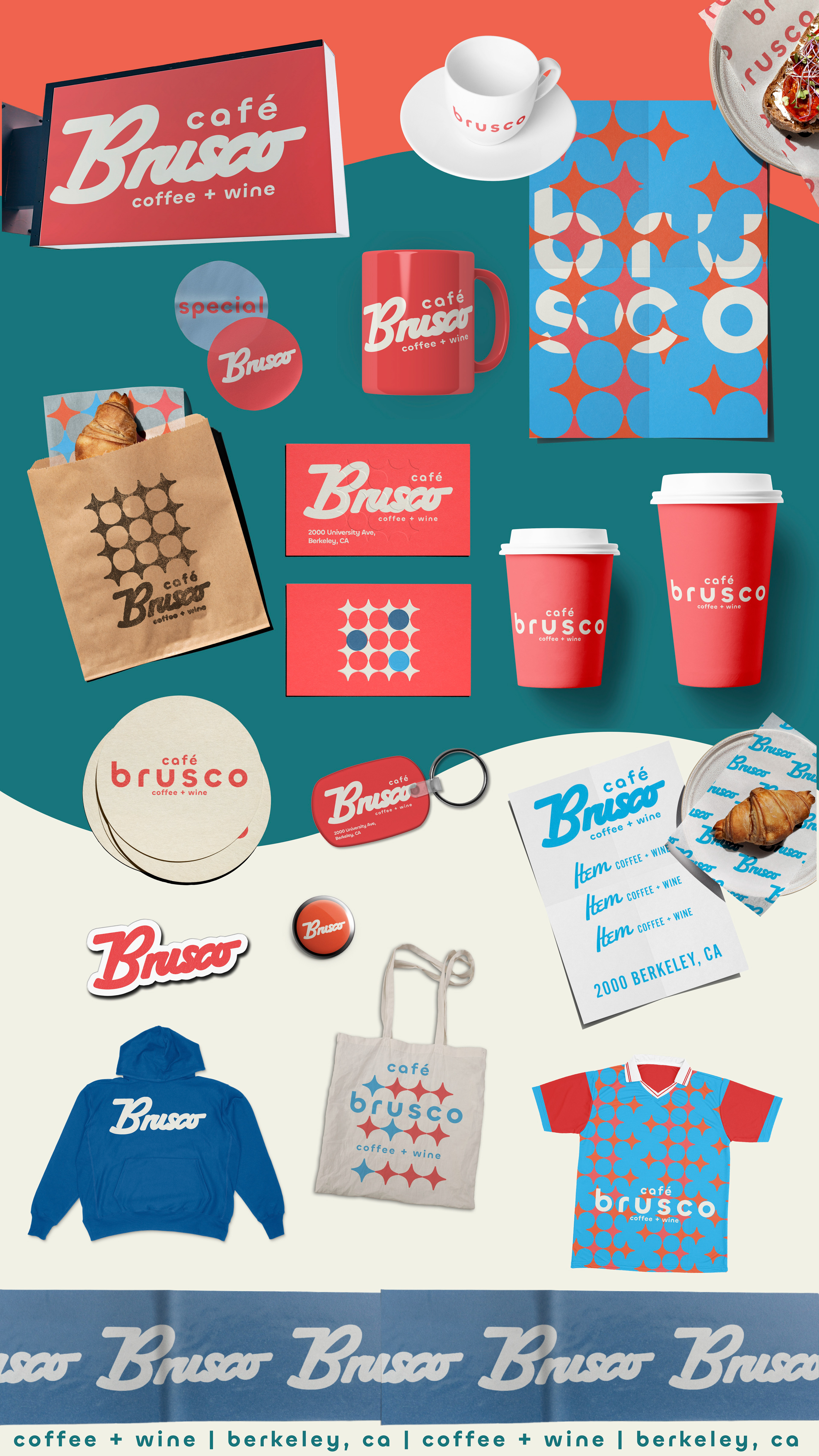 Café Brusco is a coffee shop and wine bar in Berkeley, California, created by the team behind Rose Pizzeria. Located at 2000 University Avenue, the space features swanky tiling, big sliding windows and colorful overhead lights, making it a stylish yet welcoming place to meet friends. By day, Brusco serves fresh house-made bagels with creative toppings. Rotating pastries from Good Luck Bakery. Brusco’s menu offers classic and iced coffee drinks, matcha lattes, and chai, alongside a curated evening wine list. The branding features a retro inspired starburst pattern and a warm color palette of coral, teal, sky blue and cream. Creating a cohesive identity that feels both nostalgic and fresh. Typography choices include a flowing script paired with a clean geometric sans serif, adding balance and personality across digital and print applications. Note: Some visual elements and applications may have been updated after opening to better suit the space and ambient vibe.