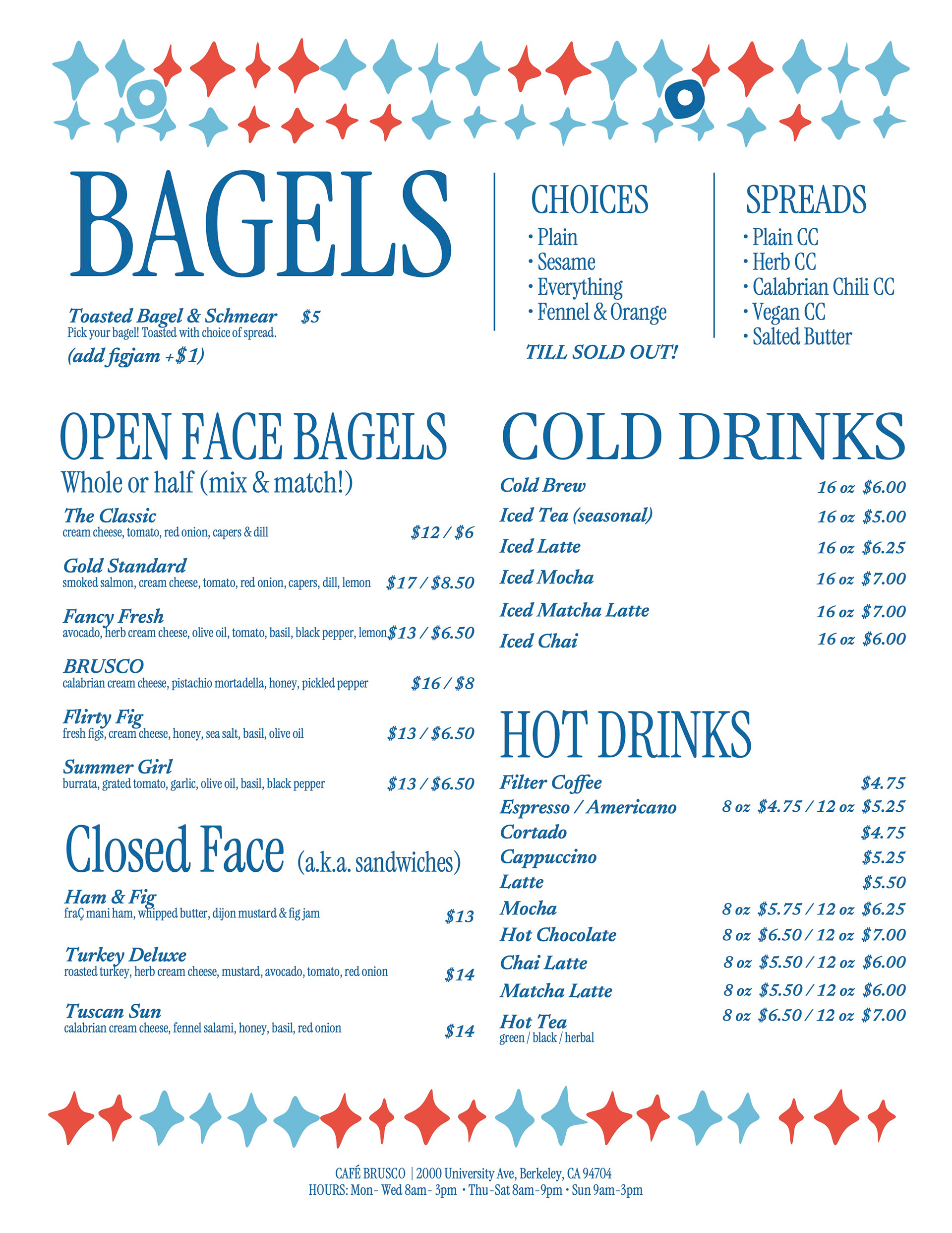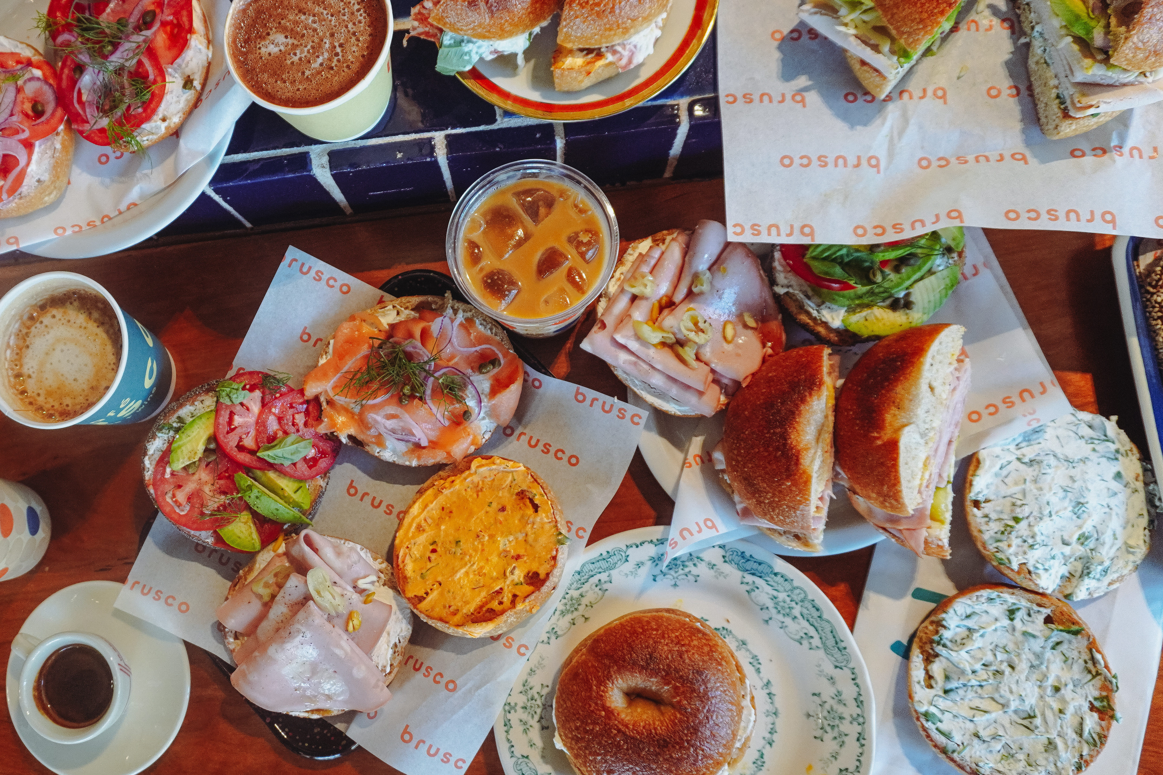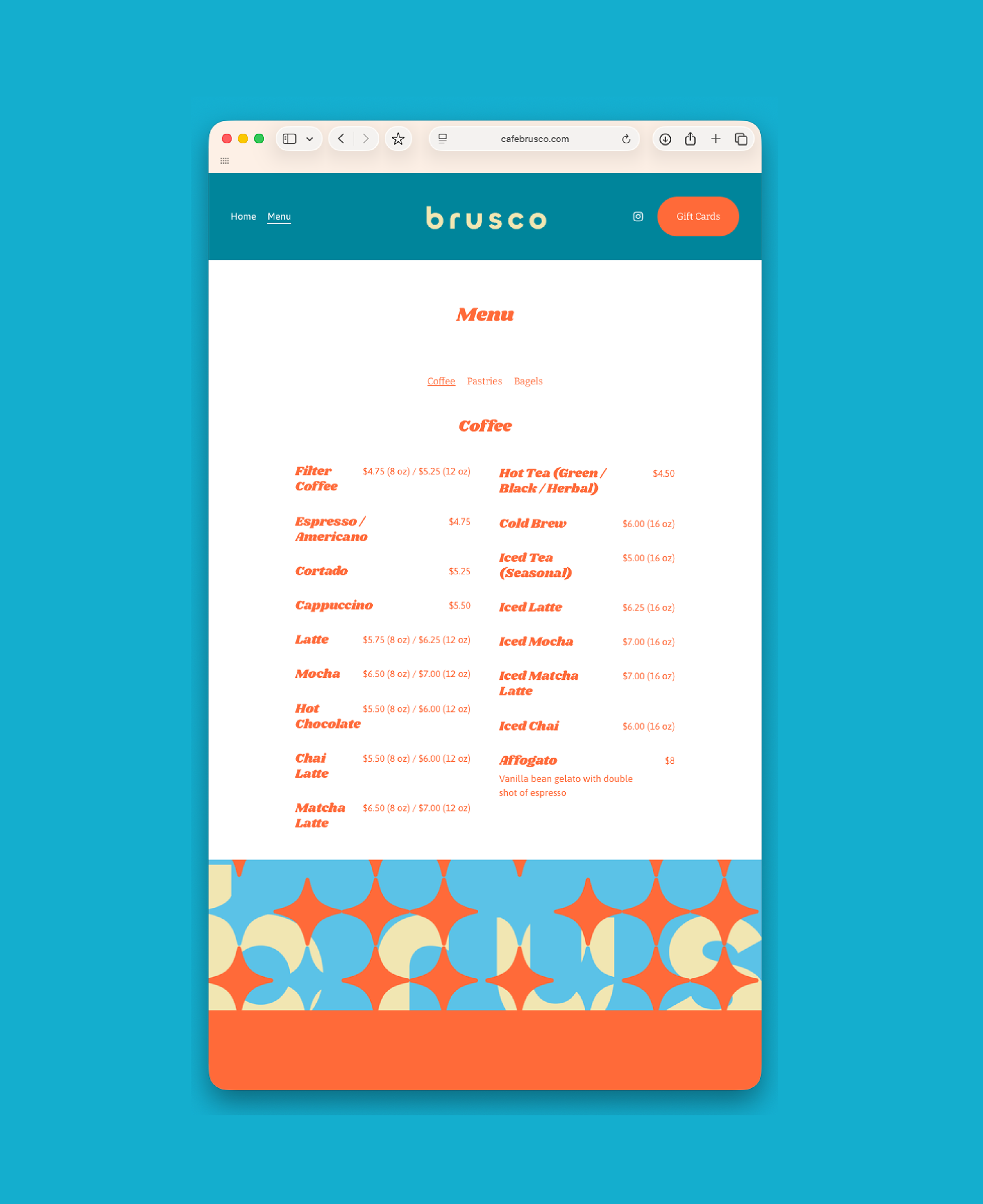 Café Brusco is a coffee shop and wine bar in Berkeley, California, created by the team behind Rose Pizzeria. Located at 2000 University Avenue, the space features swanky tiling, big sliding windows and colorful overhead lights, making it a stylish yet welcoming place to meet friends. By day, Brusco serves fresh house-made bagels with creative toppings. Rotating pastries from Good Luck Bakery. Brusco’s menu offers classic and iced coffee drinks, matcha lattes, and chai, alongside a curated evening wine list. The branding features a retro inspired starburst pattern and a warm color palette of coral, teal, sky blue and cream. Creating a cohesive identity that feels both nostalgic and fresh. Typography choices include a flowing script paired with a clean geometric sans serif, adding balance and personality across digital and print applications. Note: Some visual elements and applications may have been updated after opening to better suit the space and ambient vibe.