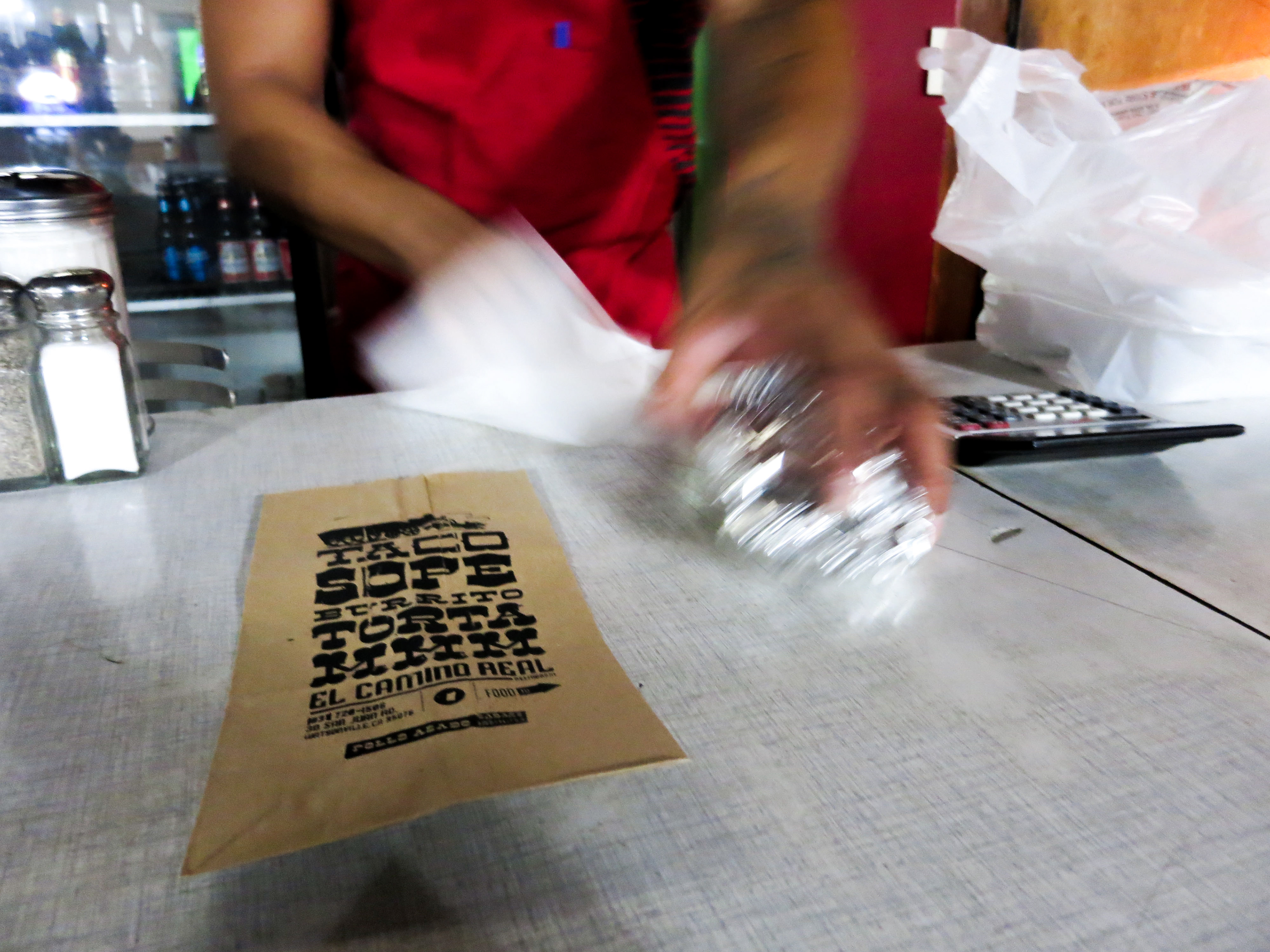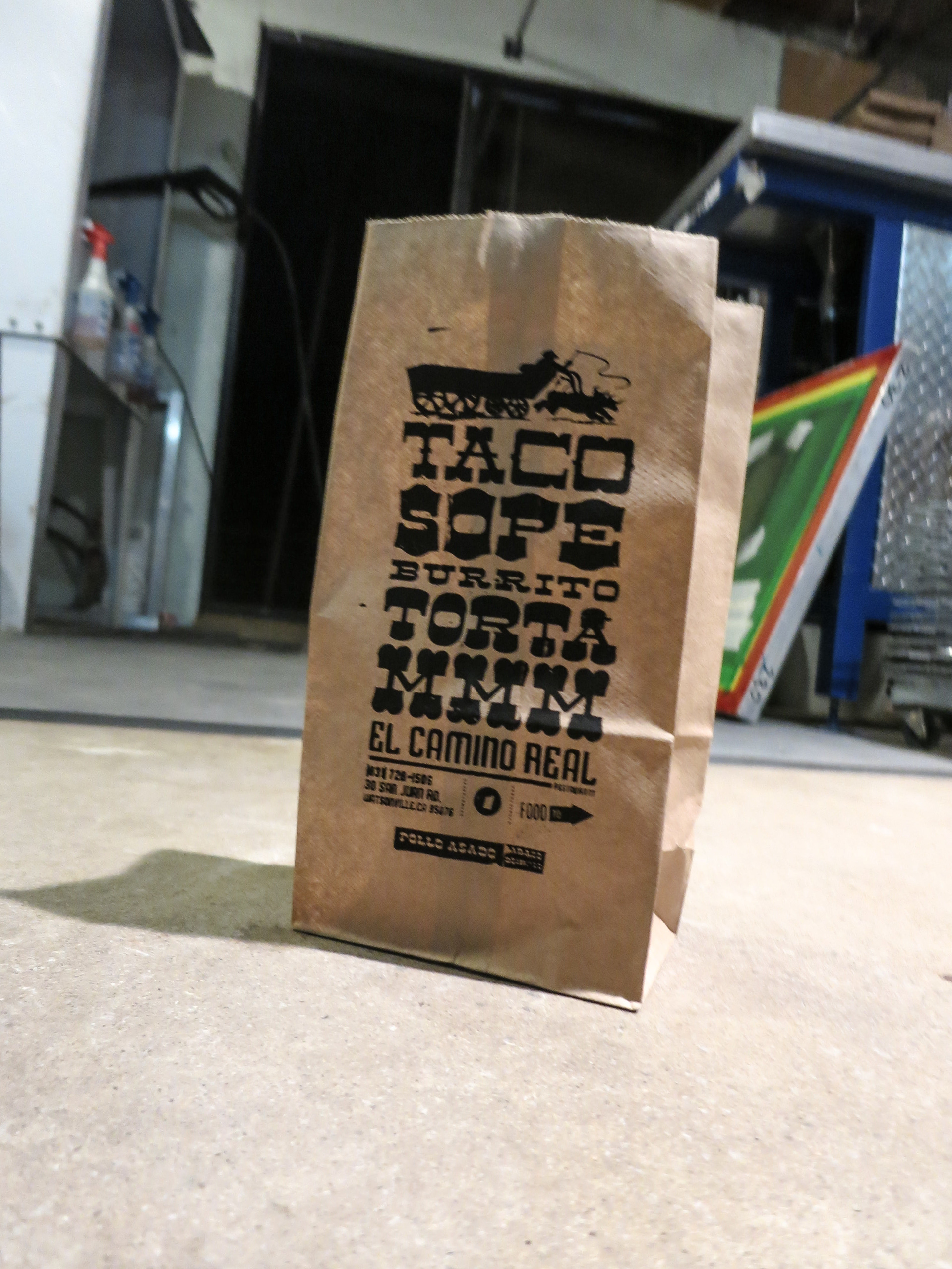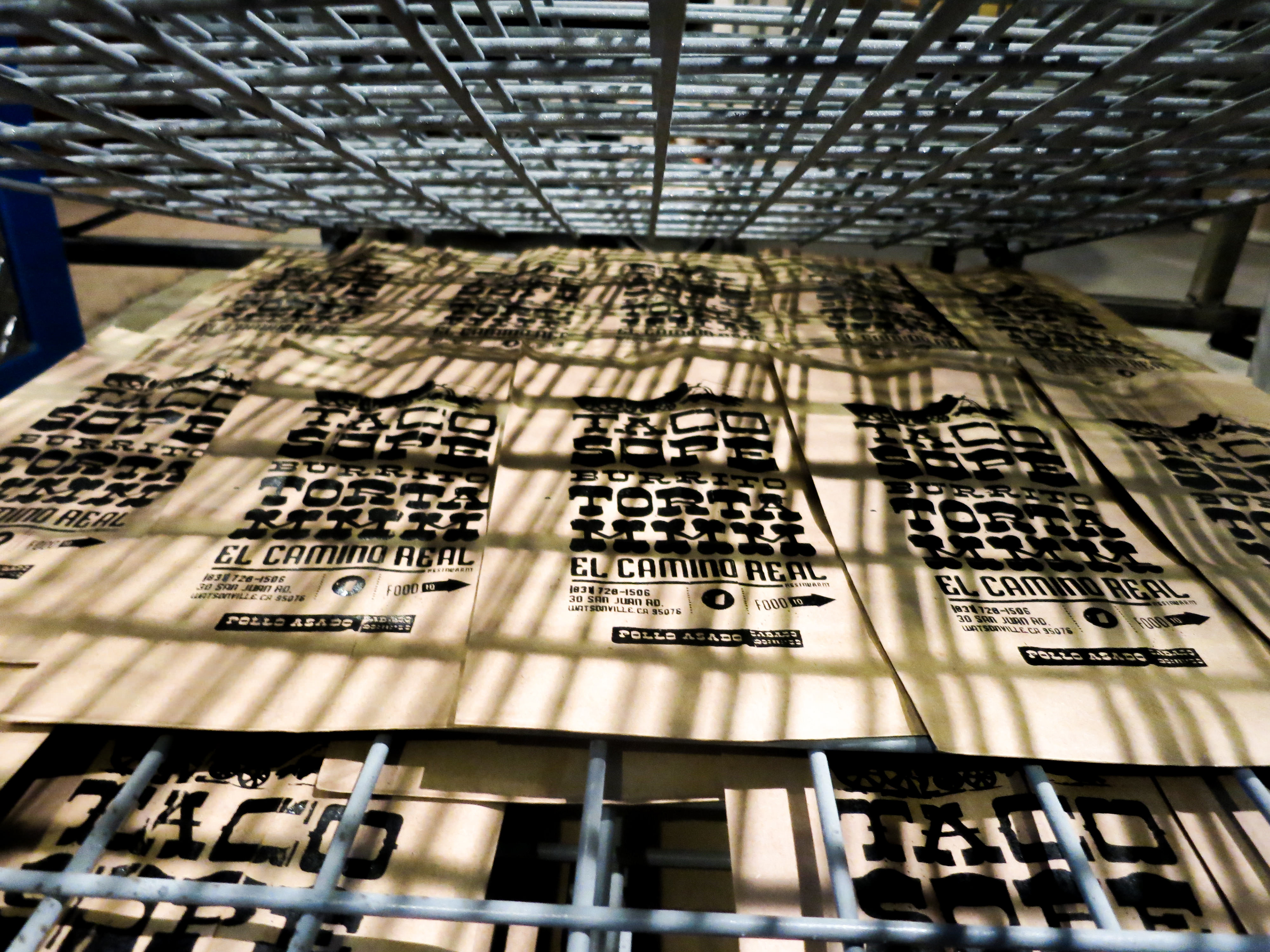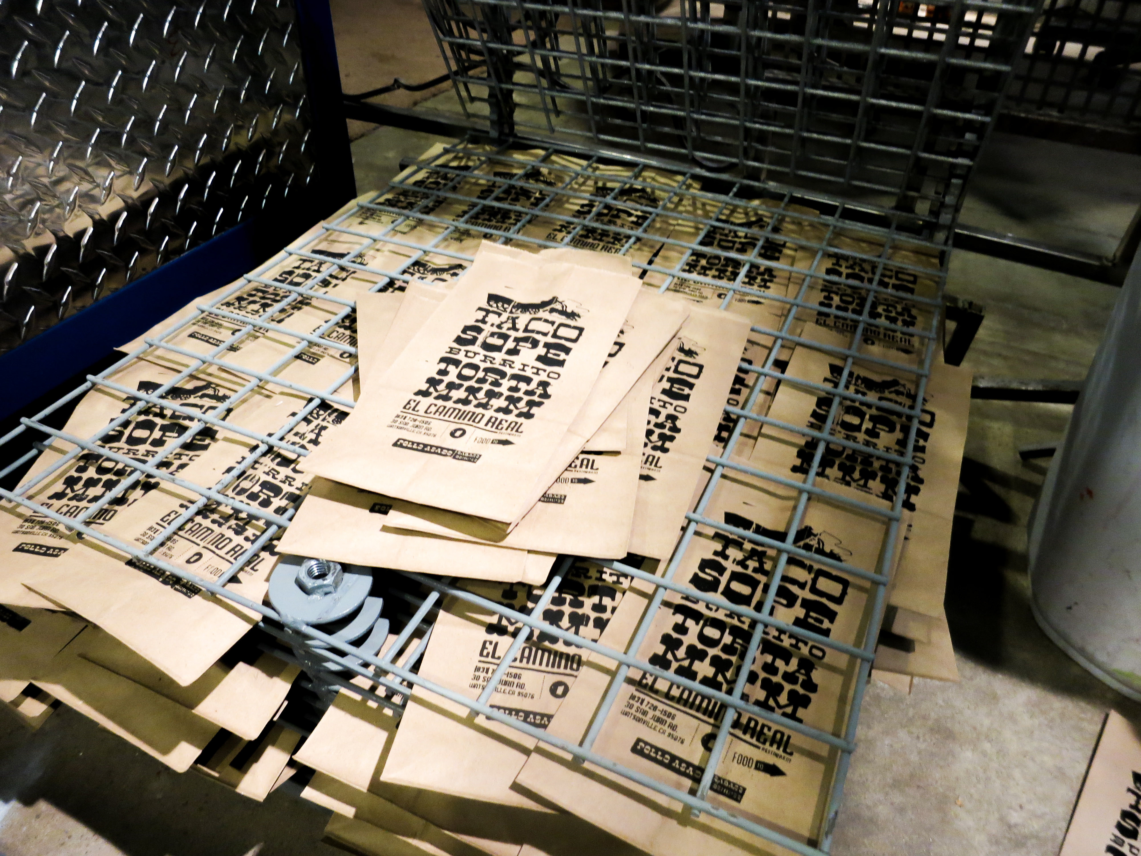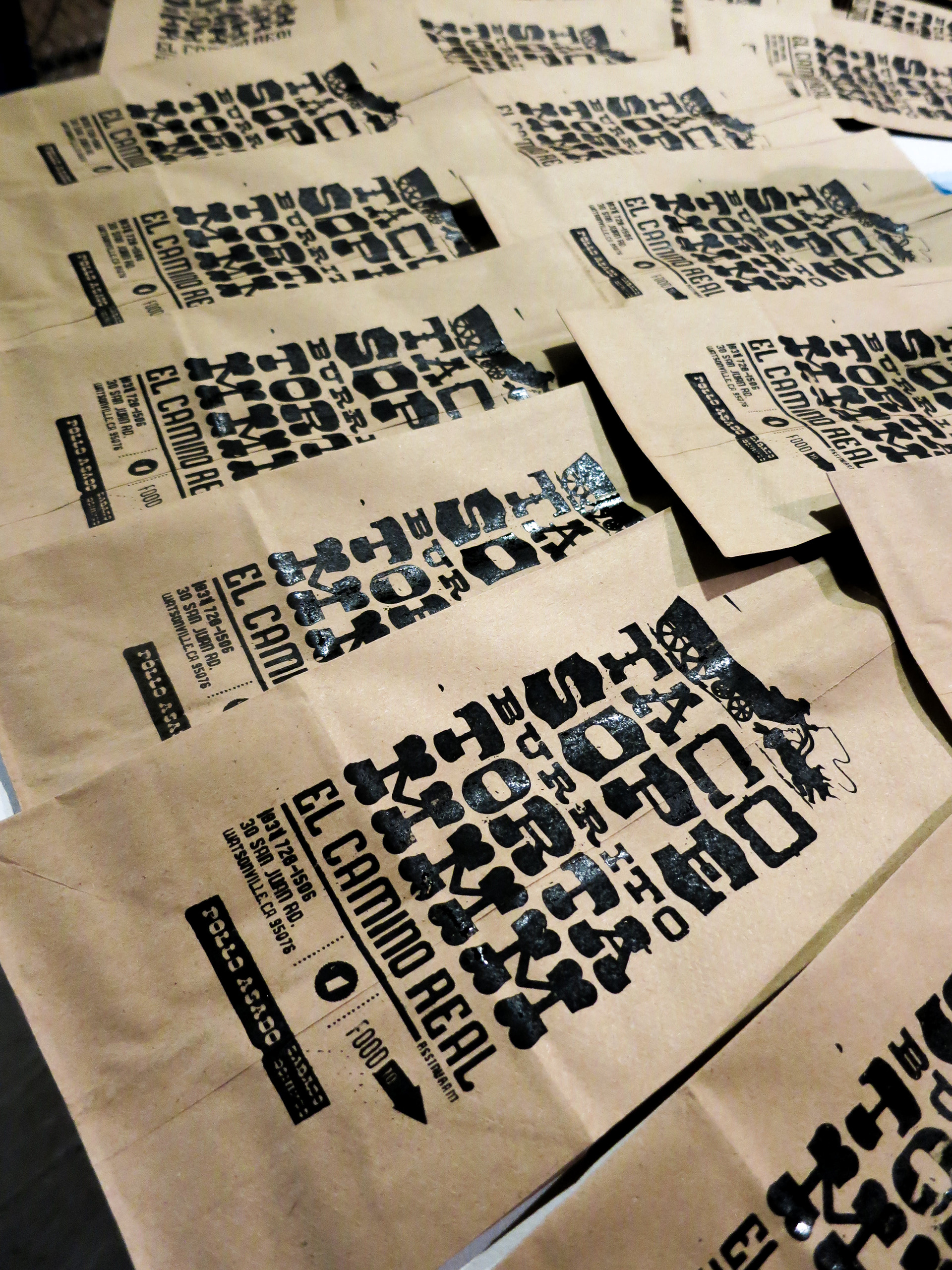 Hand pulled to-go paper bags for a mexican restaurant. Printed the first 500 in this session.